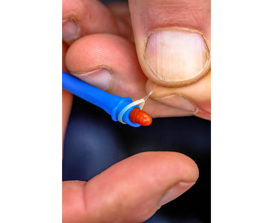 A multipurpose tool with a disgorger at one end and a banding tool at the other. The banding tool features a recess for baits such as castors or 4mm pellets to be pushed into, making the band easy to slide over the top.