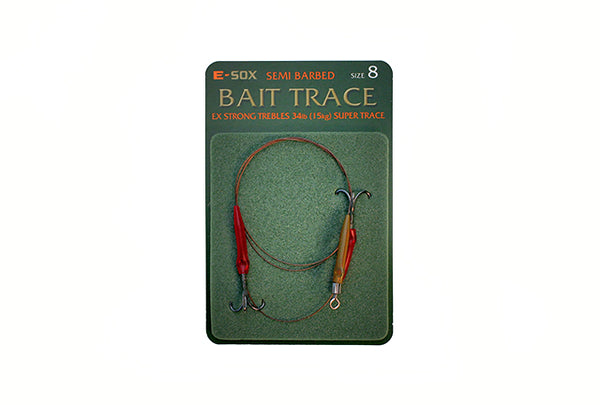 E-Sox Bait Traces are ideal for all live and deadbait presentations. Each trace is 46cm (18in) long and made from strong and reliable nylon-coated 34lb (15kg) Super Trace wire with Extra Strong Trebles.